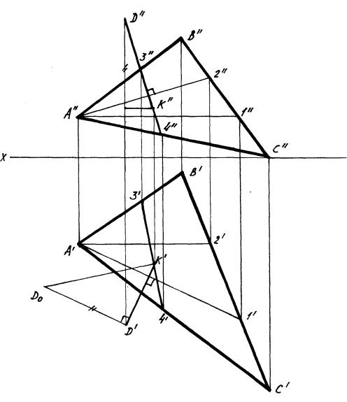 костью треугольника АВС – линия 34; в) точку К (К/,К//) находим на пересечении линии 34 и стороны 12;