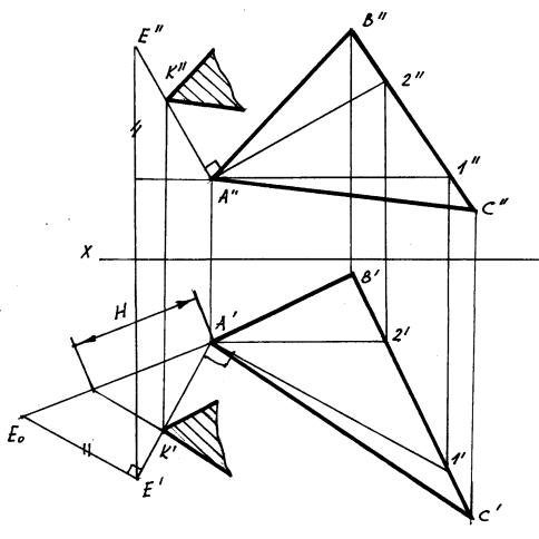 Возьмем на перпендикуляре произвольную точку Е(Е/; Е//) и найдем натуральную величину отрезка АЕ – А/Е0. На натуральной величине откладываем расстояние Н – получаем точку К0 и находим точки К/ и К//. Через полученную точку К проводим плоскость, параллельную плоскости треугольника АВС. Как известно, две плоскости параллельны, если две пересекающиеся прямые одной плоскости соответственно параллельны двум пересекающимся прямым другой плоскости. В нашем случае эту плоскость целесообразно задать двумя пересекающимися прямыми, проходящими через точку К (К/,К//) и параллельными двум любым сторонам треугольника АВС.