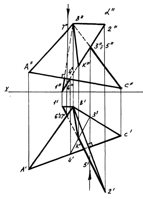 зультате этого плоскость треугольника стала перпендикулярна к плоскости 2, т. е. треугольник имеет вырожденную фронтальную проекцию - прямую А//1В//1С//1.