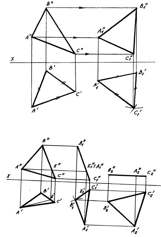 При перемещении треугольника в плоскостях, параллельных фронтальной плоскости проекции, его фронтальная проекция А//В//С// по величине не изменяется, а горизонтальные проекции точек перемещаются по линиям, параллельным оси Х.