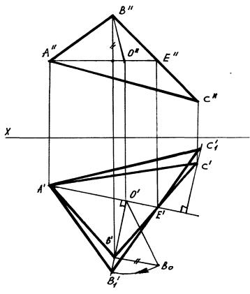 б) центр вращения точки В надо рассматривать как точку пересечения оси вращения АЕ с плоскостью вращения - это точка О (О/; О//); таким образом радиус вращения точки В – отрезок ОВ (О/В/; О//В//); если треугольник займет положение, параллельное горизонтальной плоскости проекции, то радиус вращения точки В будет в натуральную величину; определив по способу прямоугольного треугольника натуральную величину радиуса вращения, находим новое положение точки В.