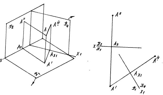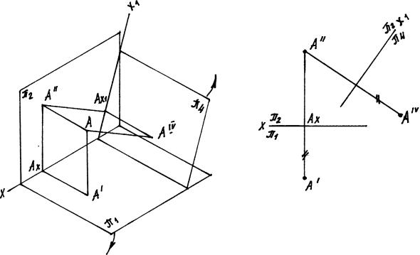 3. Рассмотрим сущность способа замены плоскостей проекций на примере точки. На рис. 10 показано введение в систему плоскостей проекций 1/2 плоскости 4, перпендикулярной к 1, и образование новой системы плоскостей 1/4.