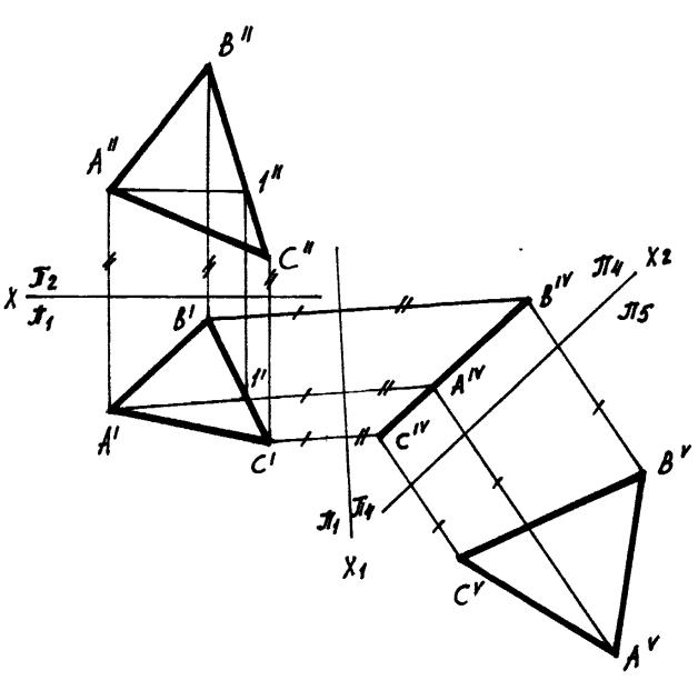 5.Затем вводим плоскость 5, перпендикулярно к 4 и после проецирования треугольника получаем проекцию АVВVСV – натуральную величину АВС.