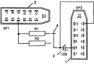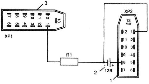 2 – аккумуляторная батарея, 3 – разъем штекерный ХР1 комбинации приборов, R1 – сопротивление МЛТ-2-250 Ом