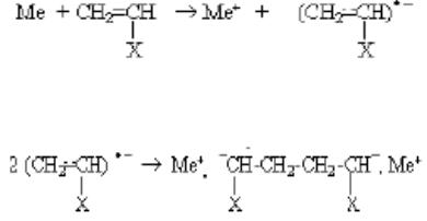 Если инициаторами являются щелочные металлы, то реакция начинается с образования ион-радикалов мономеров (ионно-координационная полимеризация):