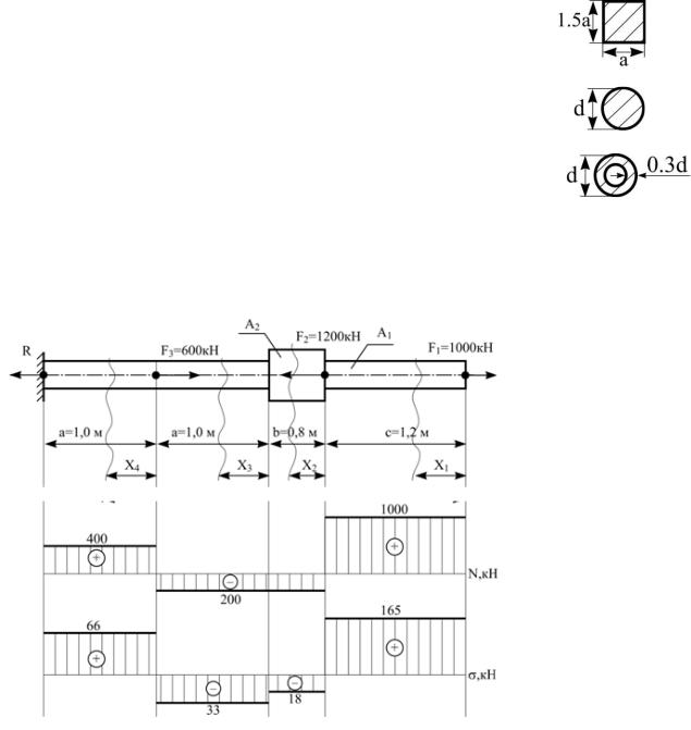 Дано: F1 =1000 кН;F2 = 1200 кН; F3 = 600 кН; a = 1,0 м; b = 0,8 м; c = 1,2 м;
