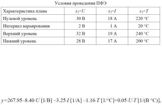 Поставим ПФЭ при трех сериях опытов в точках: U=(30±2) В, I=(18±1) А, T=(220±20) °С. Для стандартизации масштабов факторов условия проведения опытов сведем в табл. 8.