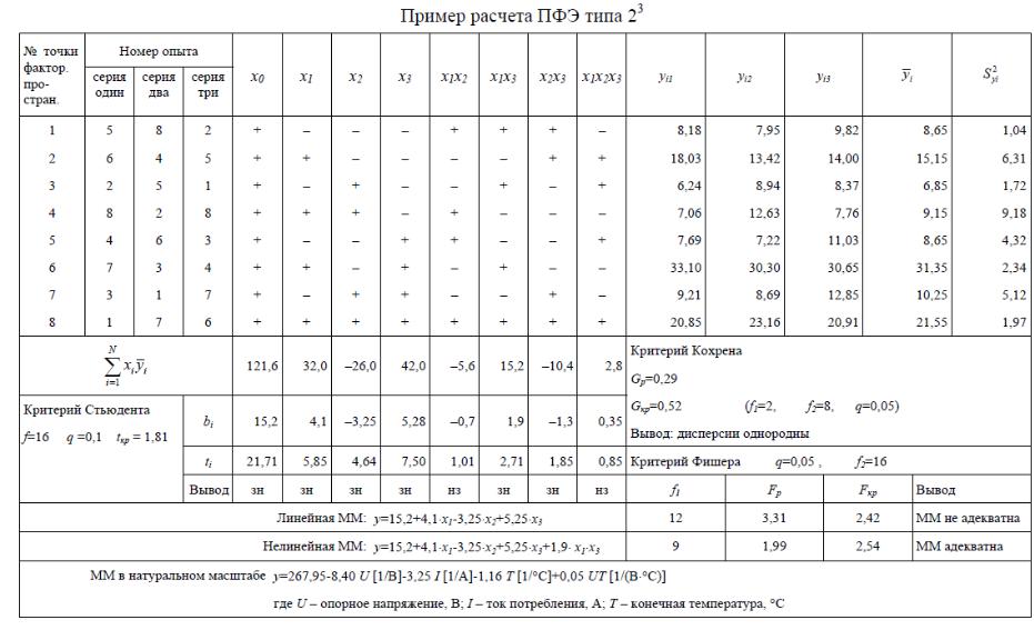 Рассчитаем оценки коэффициентов регрессионного уравнения (14–16) и проверим их статистическую значимость по критерию Стьюдента (17) при q=0,1. По критерию Фишера (23) проверим адекватность линейной модели при q=0,05. Поскольку линейная модель неадекватна, будем последовательно добавлять в ММ нелинейные взаимодействия с наибольшими коэффициентами регрессии. Для достижения адекватности ММ оказалось достаточным добавить взаимодействие x1x3. Таким образом, после перехода к физическим переменным получаем искомую ММ: