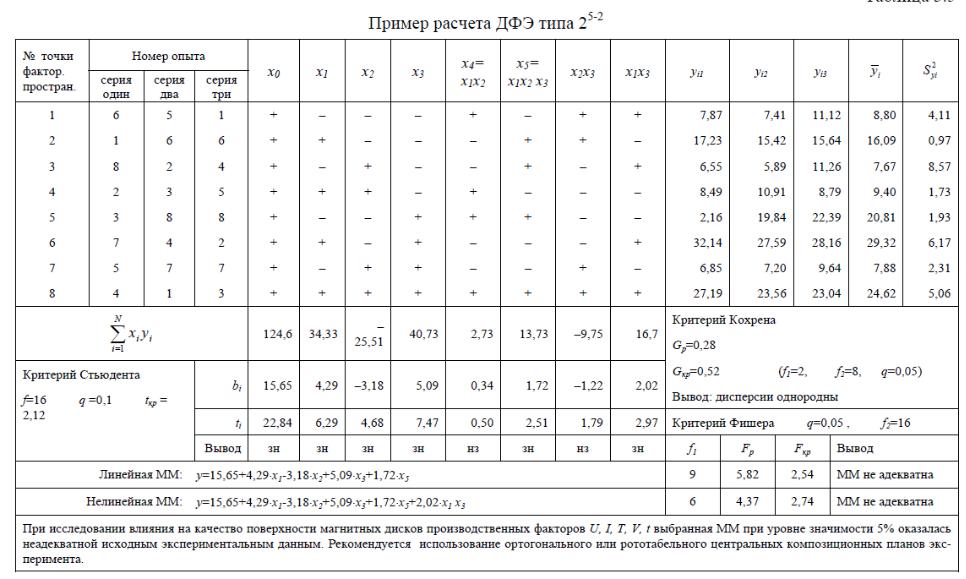 При ДФЭ стандартизация масштабов факторов, порядок постановки опытов, проверка воспроизводимости опытов, расчет оценок коэффициентов регрессионного уравнения и проверка их статистической значимости, проверка адекватности полученной ММ и переход к физическим переменным производится так же, как и при ПФЭ. Однако необходимо учитывать, что для насыщенного и сверхнасыщенного экспериментов невозможна проверка адекватности ММ, так как для нее уже не остается степеней свободы.