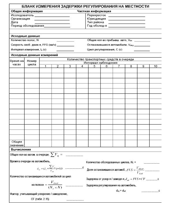На рис. 4 показан рабочий лист, который может быть использовать при измерении средней задержки транспортных средств в очереди. Перед проведением детализированного обследования наблюдателю необходимо провести измерение величины скорости свободного движения в течение обследуемого периода.