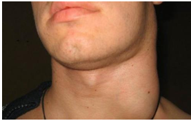 Объективно. Общее состояние удовлетворительное. Температура тела 37,0°С. Лицо симметричное. Кожа физиологической окраски. В боковом отделе шеи слева вдоль грудино-ключично-сосцевидной мышцы определяются увеличенные лимфатические узлы до 3,0 см в диаметре, плотные, безболезненные при пальпации, не спаянные между собой и окружающими тканями. Открывание рта свободное.