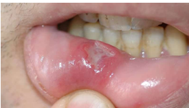 На слизистой нижней губы справа определяется язва неправильной формы, края инфильтрированы, гиперемированы, дно язвы покрыто фибринозным налетом.