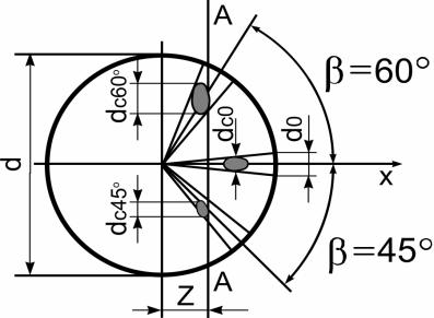 где dδ – размер сучка на поверхности бревна; dc – искомый размер сучка на пласти, находящийся на расстоянии z, от центра торца бревна; z – расстояние от центра торца бревен до пласти доски; d – диаметр бревна; β – угол наклона сучка к оси х, перпендикулярной к пласти.