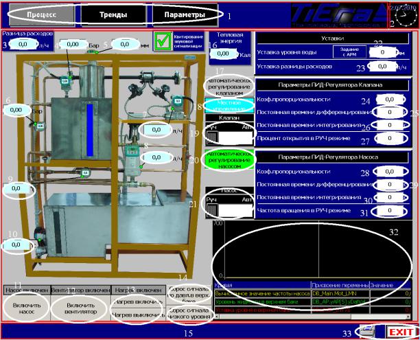 уровня в верхнем баке, а также процент открытия регулирующего клапана либо частота вращения насоса в зависимости от выбранного способа регулирования. Над мнемосхемой находятся кнопки выбора отображаемого экрана. В правом нижнем углу находятся кнопки выхода из программы, а
