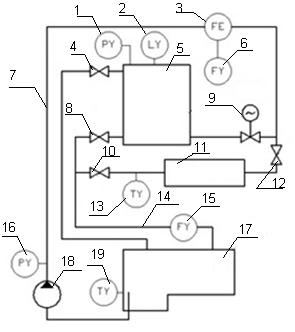 На схеме: 1 – измерительный преобразователь давления в верхнем баке, 2 – ультразвуковой уровнемер; 3 – сужающее устройство; 4, 8, 10, 12 –