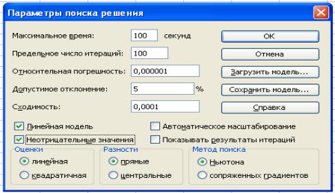 решения (рис. 5), в котором можно изменять условия и варианты поиска решения для линейных и нелинейных задач, а также загружать и сохранять оптимизируемые модели. Значения и состояния элементов управления, используемые по умолчанию, подходят для решения большинства задач.