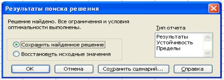 Рис. 7. Окно итогового сообщения о результатах поиска решения. Кнопка Сохранить сценарий служит для отображения окна диалога