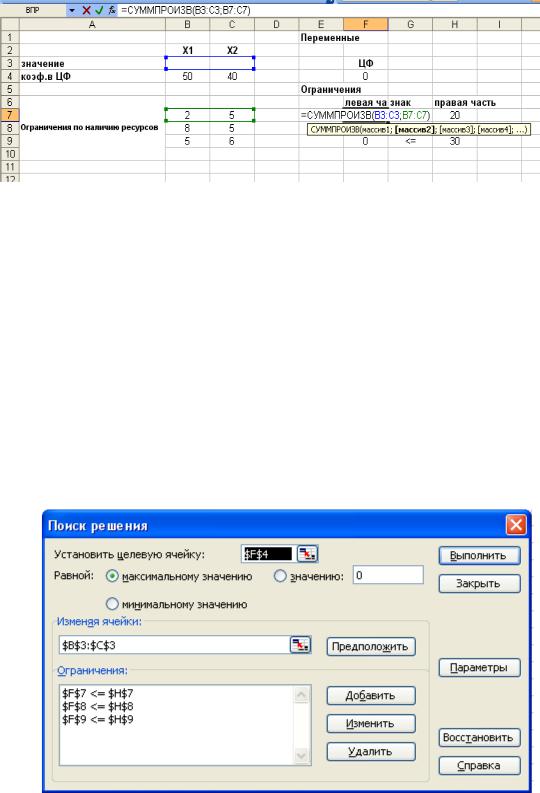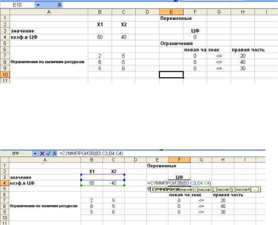 12.Введем зависимости для ограничений: в ячейки F7, F8, F9,F10 нужно ввести функции СУММПРОИЗВ(B3:C3;B7:C7), СУММПРОИЗВ(B3:C3;B8:C8), СУММПРОИЗВ(B3:C3;B9:C9), СУММПРОИЗВ(B3:C3;B10:C10) соответственно.