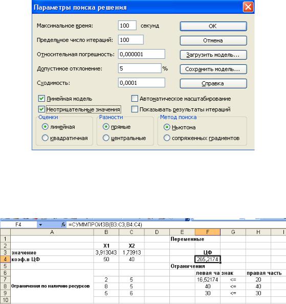 14.Введем параметры для решения ЗЛП. Для этого в диалоговом окне Поиск решения нужно нажать на кнопку Параметры и в диалоговом окне Параметры поиска решения установить флажки в окнах