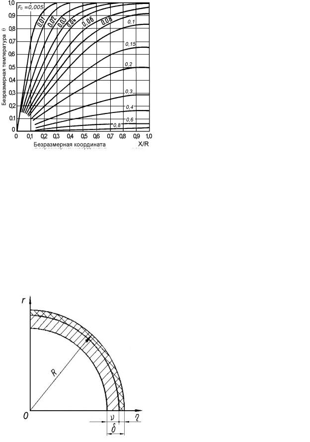 Рис. 15. Номограмма для определения безразмерной температуры: а – неограниченной пластины; б – неограниченного цилиндра