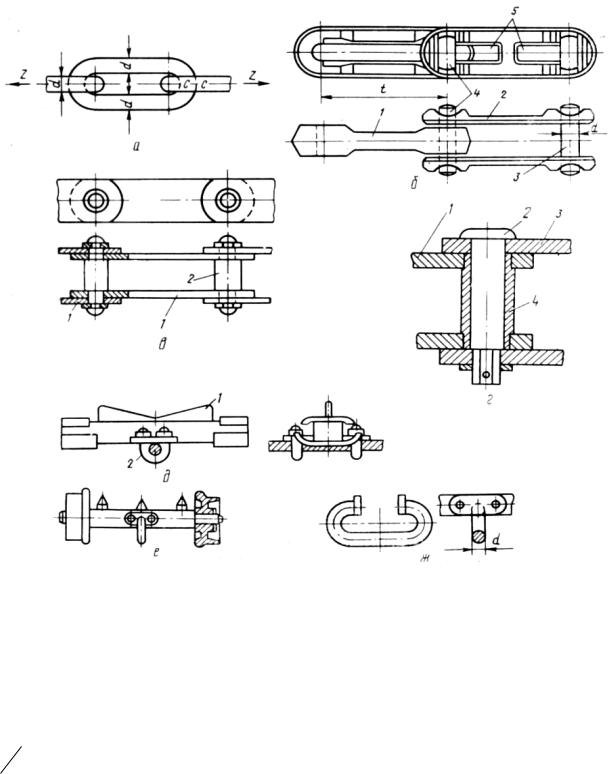Рис. 1. Тяговые устройства лесотранспортеров: а - длиннозвенная цепь из круглой стали; б - тяговая разборная цепь; в - пластинчатая штыревая цепь; г - пластинчатая втулочная цепь; д - траверса на ползушках; е - траверса на катках; ж - соединительное звено
