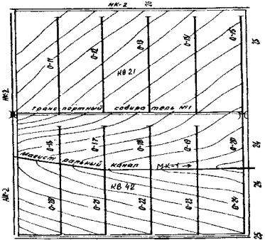 При таком размещении регулирующей сети транспортирующий собиратель №1 расположен в направлении с востока на запад; у южной просеки проектируется поворот его к магистральному каналу. Для проектирования дороги но южной просеке в квартале 42 осушители 19-23 можно повернуть вдоль просеки, используя грунт для осыпки полотна дороги. С противоположной стороны просеки для улучшения полотна дороги устраивается кювет (0-24).