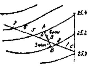 Отметки поверхности по оси канала вычисляют по отметкам горизонталей. Для этого на плане по оси канала (для которого строится профиль) разбивают пикеты через 100 м, начиная всегда от устья канала. Дальше по отметкам горизонталей вычисляют отметки поверхности на каждом пикете с точностью до 0,01 м. Отметки пикетов, расположенный между горизонталями, вычисляют интерполяцией. Например, для определения отметки ПК-3 следует через точку пикета провести линию, перпендикулярную горизонталям (рис. 3). Предположим, что длина этой линии равна 9 мм, а от пикета до точек А и В (до горизонталей) расстояния соответственно равны 6 и 3 мм. Превышение расстояния на 3 мм равно 0,2 · 3 / 9 = 0,07 м, а на 6 мм 0,2 · 6 / 9 = 0,13 м. Вычитая из отметки 25,4 превышение 0,13 или прибавляя к отметке 25,2 превышение 0,07, получаем отметку поверхности ПК-3, равную 25,27. Таким способом определяют отметки на каждом пикете.