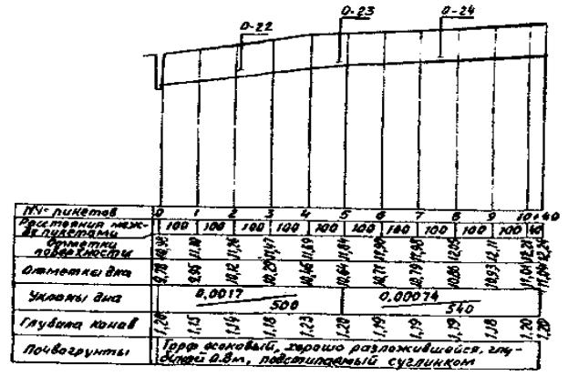 При наиболее простом случае проектирования дна уклон поверхности по оси канала более или менее одинаковый и находится в пределах допустимых уклонов дна. В этом случае вниз от линии поверхности откладывают проектную глубину осушителя в устье (нулевой пикет) и вверху (на последнем пикете) канала, полученные точки соединяют прямой линией и определяют уклон дна.