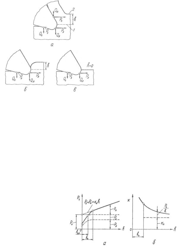 (рис. 9.1,а). Из рисунка видно, что лезвие и задняя поверхность резца находятся ниже поверхности резания. Поэтому даже при нулевой номинальной толщине стружки (h=0), когда поверхности 1 и 2 совпадают (рис. 9.1,в), силы воздействия не будут равны нулю, так как присутствуют силы Рл, Qл, Рз и Qз. Наблюдения за процессом резания показали, что увеличение номинальной толщины стружки не сразу приводит к образованию факти-ческой стружки; силы нарастают, но поверхность обработки продолжает подминаться резцом (рис. 9.1,б). Лишь при определенной толщине номинальной стружки hкр, которая называется критической, наблюдается сход стружки по передней поверхности резца, то есть начинает срезаться фактическая стружка. Критическая толщина стружки в несколько раз превышает радиус затупления резца ρ. Зависимость сил резания от толщины стружки обычно рассматривается для единичных сил Р1 и Q1 (Н/мм), приходящихся на 1 мм ширины стружки.