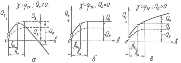 Нормальная сила резания также зависит от толщины стружки (рис. 9.3). Пока номинальная толщина стружки не достигла критической, то есть h>hкр, единичная нормальная сила Q1 складывается из сил Qл и Qз, которые увеличиваются с ростом h. За пределами hкр к этим двум положительным силам добавляется сила Qn по передней поверхности резца, которая может быть либо отрицательной (при γ ˃ φтр), либо равной нулю (при γ = φтр), либо