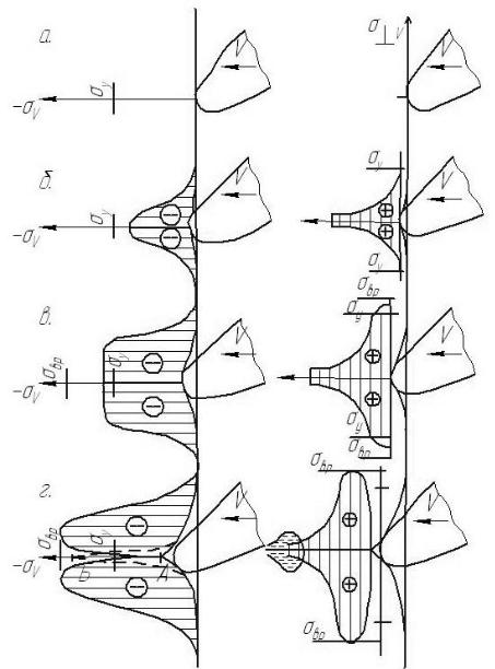 Рисунок 10.1. Диаграмма нормальных напряжений отдельных фаз внедрения резца в древесину: а – в период касания; б – при упругом деформировании; в – при упругопластическом деформировании; г – при разрушении поверхностного слоя материала