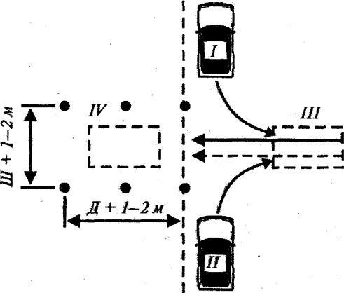Ш – ширина автомобиля; Д – длина автомобиля; I – исходное положение для въезда в бокс передним ходом; II – исходное положение для въезда в бокс задним ходом