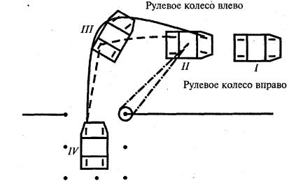 –когда автомобиль окажется в положении III под углом в 45° к исходному положению I, и правую стойку можно будет видеть через заднее боковое стекло, начинаем вращать рулевое колесо влево;