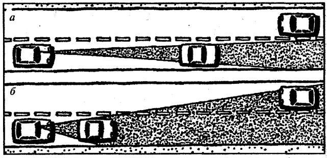 а– при большой дистанции между автомобилями; б – при малой дистанции между автомобилями