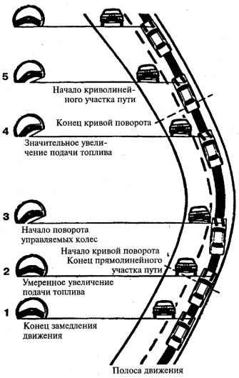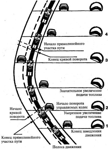 2– умеренно увеличивать подачу топлива, автомобиль входит в поворот до начала вращения рулевого колеса. Еще раз оценить обстановку через зеркала заднего вида и обстановку впереди;