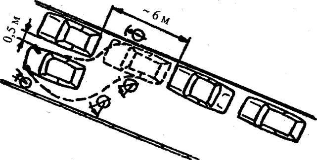 Когда автомобиль стоит на стоянке вдоль тротуара параллельно дороге и свободное место между автомобилями ограничено, заезжать на стоянку лучше также задним ходом, как показано на рис. 30.