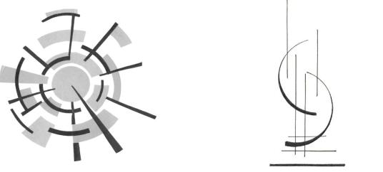 На рис. 10 элементы композиции случайным образом разбросанные на композиционном поле создают впечатление незавершенности: кажется, что разнообразные элементы разлетаются в разные стороны. Причем это зрительное движение настолько сильное, что возникает ощущение, что композиция продолжается в разные стороны до бесконечности. Кроме того, внутренний порядок нарушен из-за композиционной неустойчивости – элементы закомпонованы в круг в нижней части. Аналогичные ощущения создает и композиция на рис. 10: ощущение незавершенности возникает из-за постоянного движения по кругу и отсутствия понятия «верх» и «низ». Рис. 11, напротив, иллюстрирует удачную в этом смысле композицию.