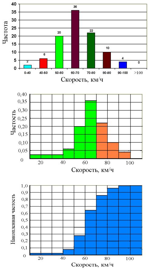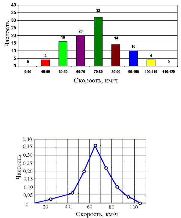 Средняя скорость ТП равна 66 км/ч. Закон распределения скоростей приближается к закону нормального распределения. По гистограммам легко видеть, что 36% автомобилей превышают скорость 70 км/ч.