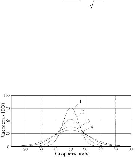 Рис.8. Функции нормального распределения скоростей: 1 – = 5, 2 – = 7,5, 3 – = 10, 4 – = 12,5 км/ч
