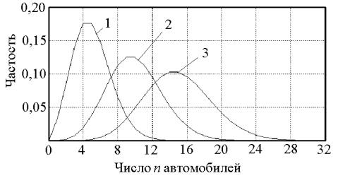 Рис. 19. Вероятности (частости) прохождения n автомобилями сечения дороги при интенсивностях 1 – 200, 2 – 400 и 3 – 600 авт/ч за время 1,5 мин