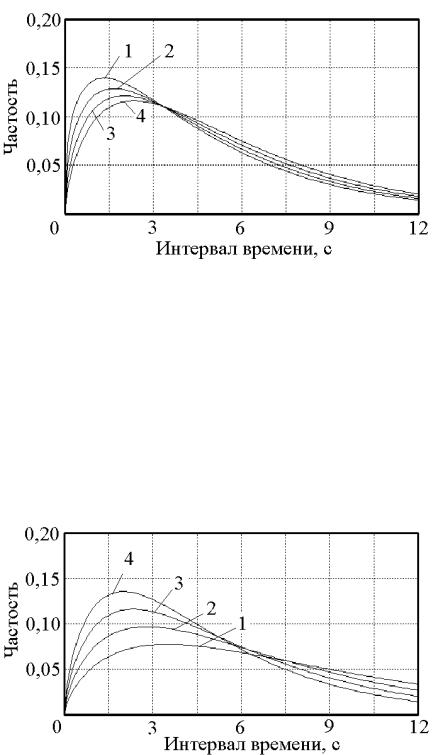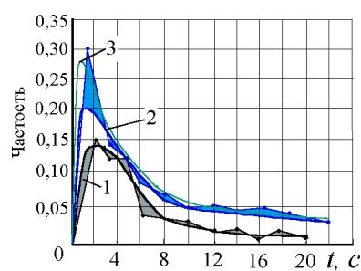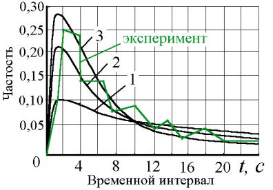 Рис. 21. Распределение временных интервалов, рассчитанное с поправочным коэффициентом : 1 – = 0,5; 2 – = 1; 3 – = 1,5