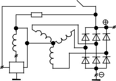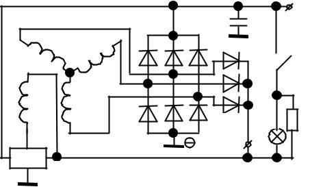 Дополнительный выпрямитель состоит из диодов Д7…Д9. Эти диоды подключены к фазам статора генератора, вывод нулевой точки фаз не используется. Контроль работы генератора осуществляется также с помощью лампы контроля заряда.