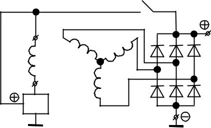 По такой схеме обмотка возбуждения питается от дополнительного выпрямителя и при неработающем двигателе разряд аккумуляторной батареи снижается.