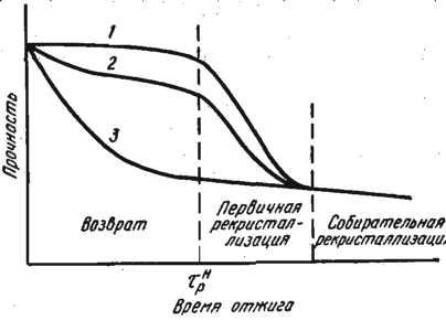 В инкубационный период до начала первичной рекристаллизации, когда происходит только возврат, наклеп может практически совсем не уменьшаться (кривая 1), частично уменьшаться (кривая 2) и полностью сниматься (кривая 3).
