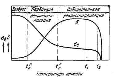 Если в интервале первичной рекристаллизации прочностные свойства сильно падают, то в интервале собирательной рекристаллизации они снижаются слабо.