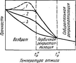 В зависимости от температуры и продолжительности отжига в металле проходят разные структурные изменения и соответственно по-разному протекает разупрочнение.