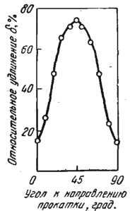 Анизотропия свойств выражена на графике в координатах свойство – угол к направлению прокатки (рис. 49).