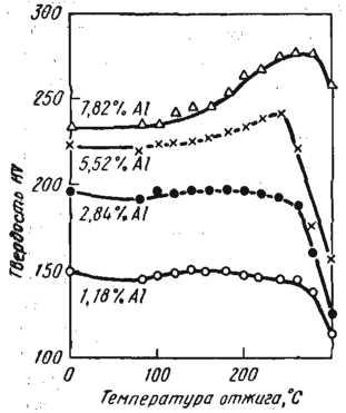 Рис. 47. Влияние температуры отжига на твердость холоднокатаных алюминиевых бронз