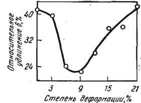 В области околокритических деформаций относительное удлинение отожженных металлов и сплавов с увеличением степени предварительной (перед отжигом) деформации снижается, достигает минимума при критической деформации и затем возрастает (рис. 45).