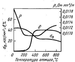 Рис. 44. Влияние температуры часового отжига на электросопротивление и механические свойства меди M1 (А. П. Смирягин)